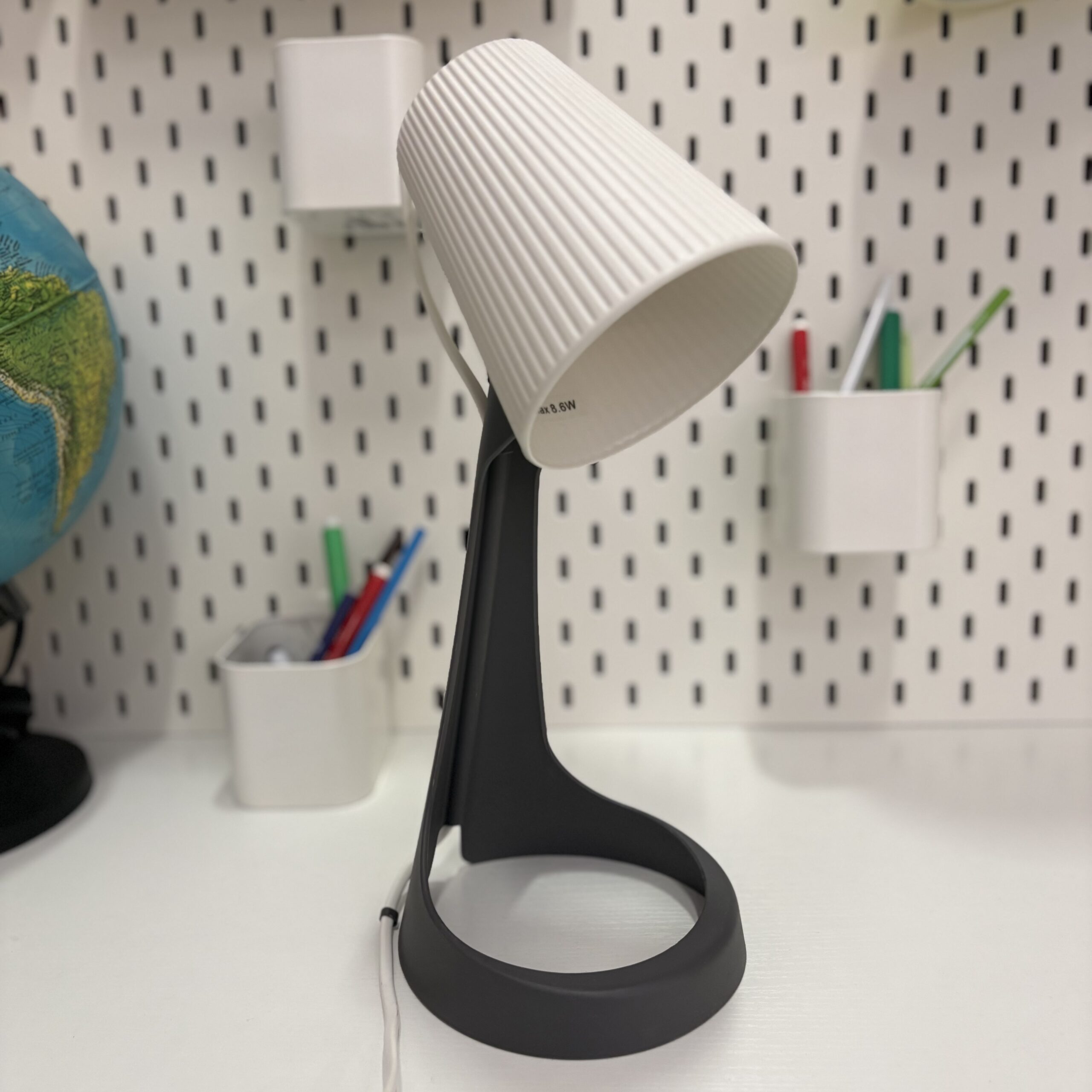 Il paralume, di forma conica, è di colore bianco opaco e presenta una distintiva texture a coste verticali, che aggiunge un elemento tattile e visivo interessante. Questa finitura superficiale contribuisce a diffondere la luce in modo morbido e uniforme, rendendo la lampada funzionale oltre che esteticamente gradevole. All’interno del paralume è visibile l’indicazione “max 8.6W”, suggerendo l’utilizzo di una sorgente luminosa a basso consumo energetico, tipicamente LED, che garantisce un’illuminazione efficiente e una ridotta emissione di calore, aspetto rilevante per la sicurezza sul set.